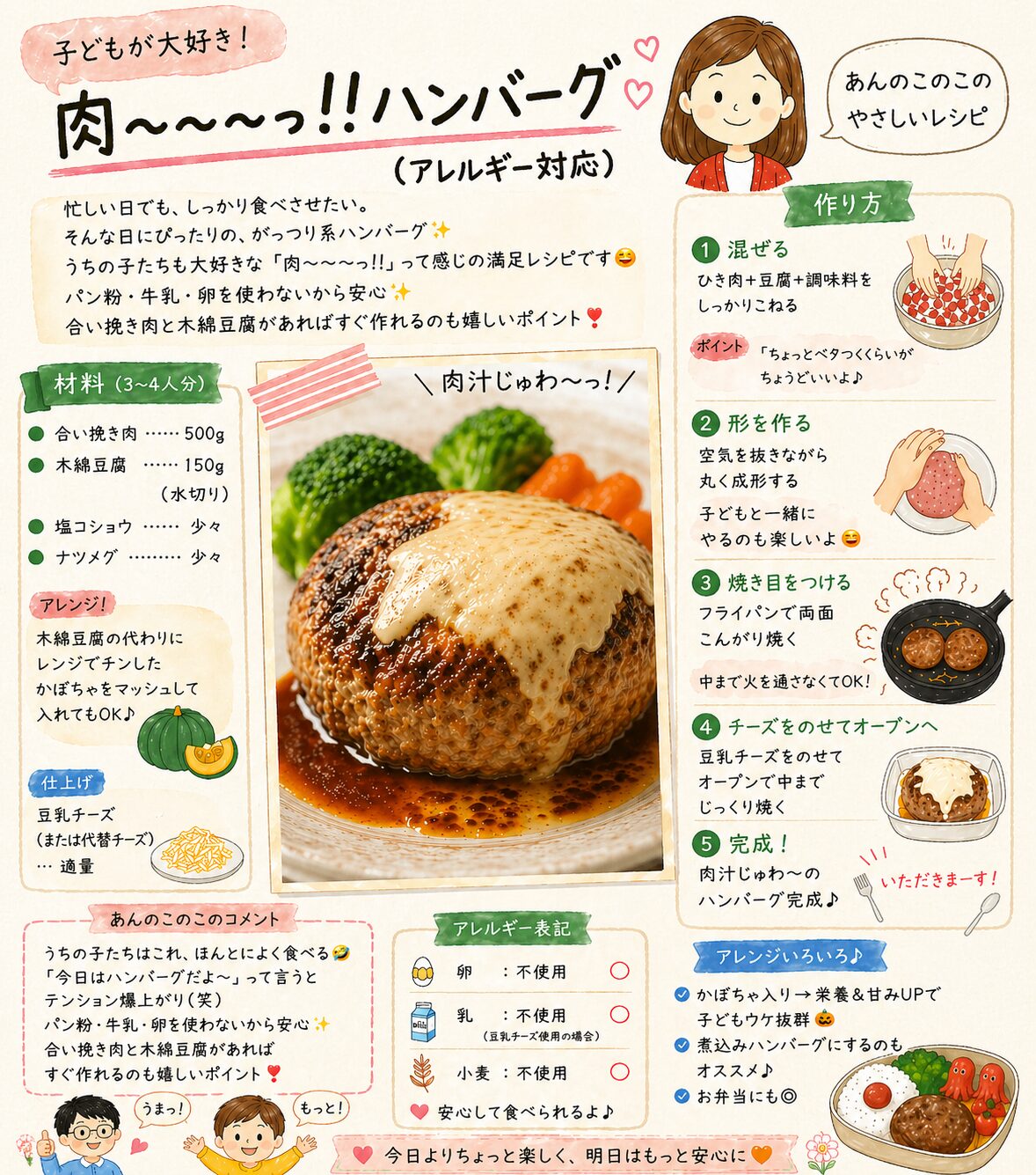 パン粉・牛乳・卵を使わないから、アレルギーっ子のいるおうちでも安心!